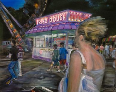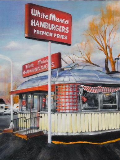 I celebrate highway architecture and signage by painting the remains of the days when Americans could afford to be whimsical in their plans, individual in their pursuits, and optimistic about their prospects. These buildings, still wondrous yet fading like a dream come morning, are my own personal metaphor of aging. They are also a dual l