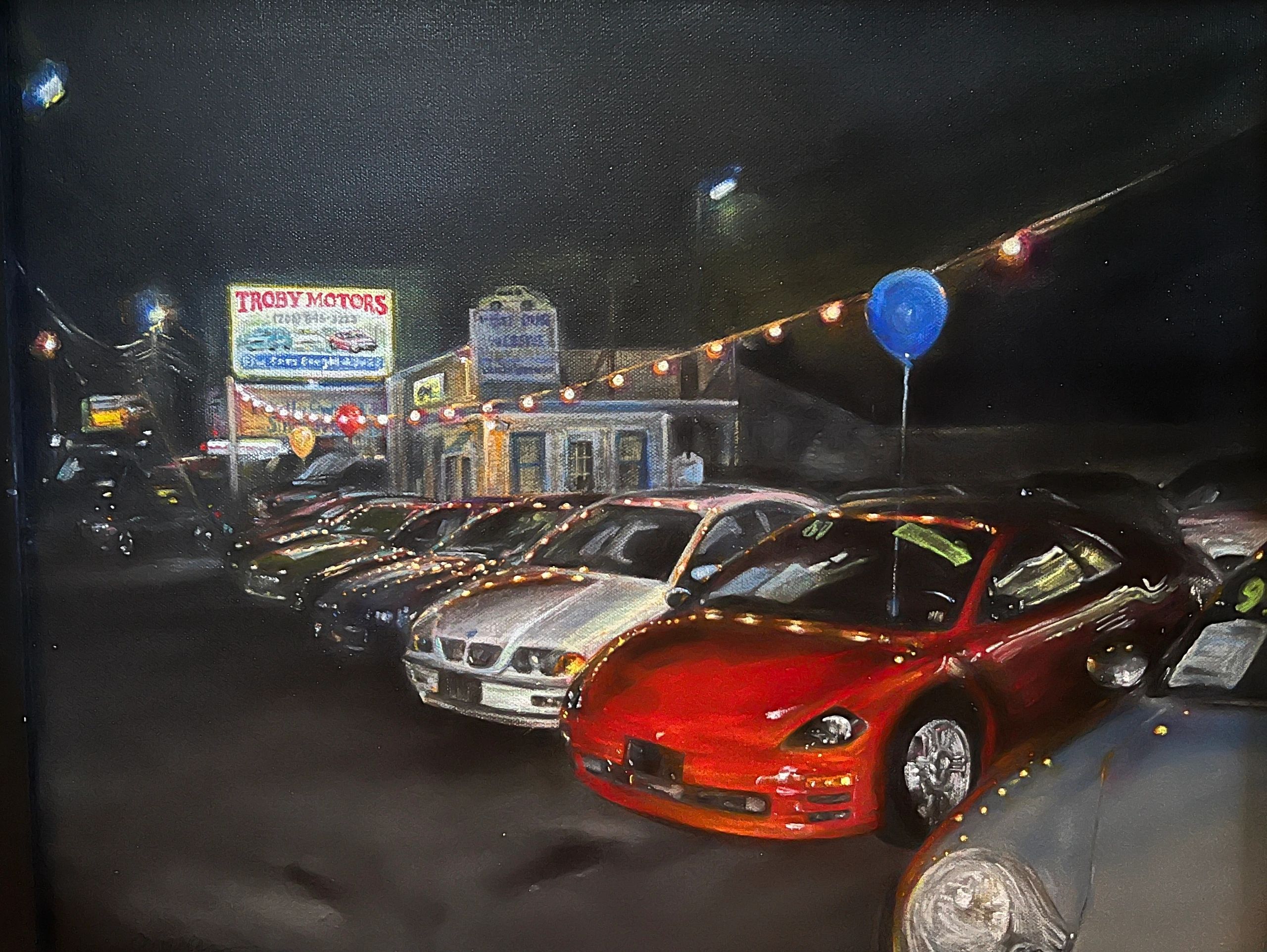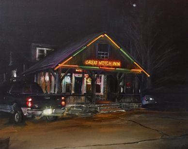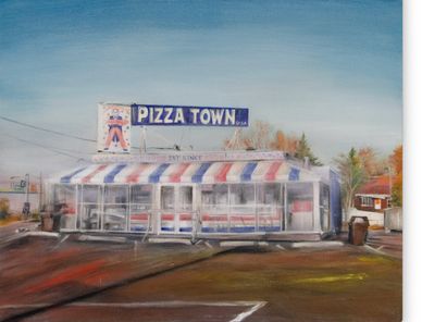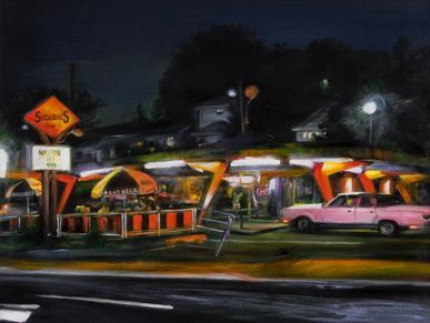 I celebrate highway architecture and signage by painting the remains of the days when Americans could afford to be whimsical in their plans, individual in their pursuits, and optimistic about their prospects. These buildings, still wondrous yet fading like a dream come morning, are my own personal metaphor of aging. They are also a dual legacy of the painted and the paintings as I race against the effects of time, space, and sprawl to capture tangible remnants of my youth and leave behind a visual record of myself as an artist. I hope they make you smile.